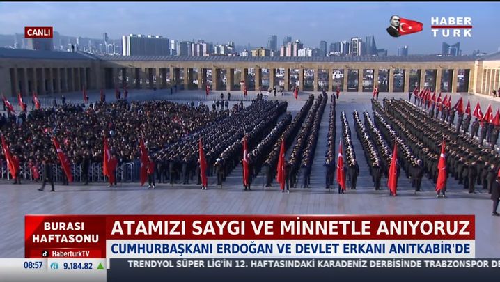Cumhurbaşkanı Erdoğan, kırmızı beyaz karanfillerden oluşan ay yıldızlı çelengi, Atatürk’ün mozolesine bıraktı. Atatürk’ün 86 yıl önce vefat ettiği saat olan 09.05’te saygı duruşunda bulunuldu ve ardından İstiklal Marşı okundu.